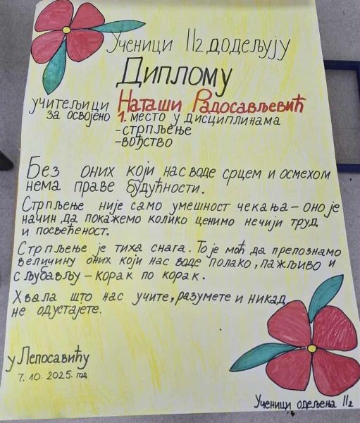 • Ученици 2/1 направили су диплому захвалности за учитељицу Драгану Ивановић.