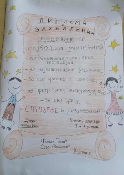Ученици су осмислили и уручили диплому захвалности свим учитељима за стрпљење и разумевање у свакодневном раду.